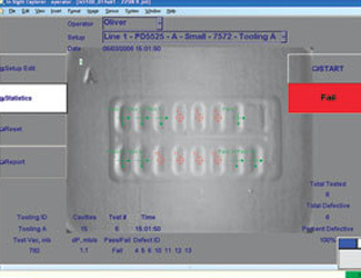 康耐視 In-Sight 將真空泄露測試與機器視覺結(jié)合在一起。Packaging Technologies & Inspection 設計該系統(tǒng)目的是用于對罩板包裝的完整性進行測試。在配置該系統(tǒng)之前,他們必須使用以下兩種破壞性方法之一進行測試:滲色測試法或嚴格的真空泄露測試法。通過將真空泄露測試與 In-Sight 相結(jié)合,可形成單一的非破壞性測試方法。該系統(tǒng)可以通過真空泄露測試找出所有有缺陷的罩板包裝。一旦找到有缺陷的包裝,In-sight 就會捕捉該包裝的圖像。通過此圖像,In-Sight 能夠識別出有缺陷的特定罩板腔并能評估其余包裝的質(zhì)量。