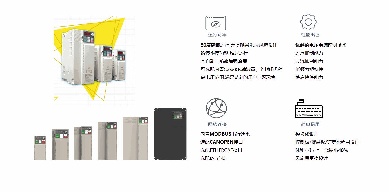 FR-E系列是禾川高性能矢量控制變頻器,支持電流矢量控制技術,50°滿載運行,模塊化設計,體積小巧,通訊兼容豐富,可針對物流 木工 包裝 紡織等OEM領域廣泛應用。