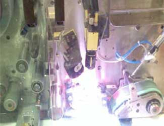 金霸王公司光電池在生產(chǎn)線上的移動(dòng)速度是每分鐘1200個(gè),當(dāng)感應(yīng)開關(guān)檢測(cè)到每個(gè)光電池經(jīng)過時(shí),PLC的高速計(jì)數(shù)器會(huì)給前端的標(biāo)簽位 置檢測(cè)相機(jī)和打印檢測(cè)相機(jī)發(fā)送觸發(fā)信號(hào)啟動(dòng)檢測(cè),這2臺(tái)相機(jī)檢測(cè)完之后,包好標(biāo)簽的電池通過熱封進(jìn)入到下一步電池正負(fù)極缺陷檢測(cè)。其中標(biāo)簽位置檢測(cè)和打印有無檢測(cè)使用多色點(diǎn)光源, 正負(fù)極缺陷檢測(cè)使用多色同軸光源,4臺(tái)相機(jī)配用4個(gè)IO模塊進(jìn)行產(chǎn)品種類的切換和結(jié)果輸出。每個(gè)位置檢測(cè)時(shí)間都調(diào)節(jié)在50ms以內(nèi),檢測(cè)不合格的電池會(huì)被剔除機(jī)構(gòu)剔除,合格品會(huì)流入最后的包裝環(huán)節(jié)。