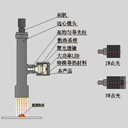 高亮點(diǎn)光源是利用大功率LED通過光學(xué)透鏡聚焦后發(fā)出平行光的原理研制而成的,與傳統(tǒng)的光纖鹵素?zé)粝啾染哂辛炼群愣?、色度均勻、使用壽命超長(zhǎng)等特點(diǎn)。頂端直徑為8mm,體積小,散熱性能好。